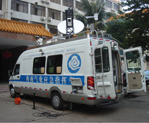 此車解決了我國氣象事業缺乏大型綜合裝備。它能在重大活動及突發公共事件的現場迅速搭建起一個氣象測報平臺,可實時采集現場各種氣象信息,并在第一時間通過衛星通訊鏈路將數據和語音、視頻進行雙向傳輸,實現信息實時共享及氣象視頻會商。豪華內飾、專業電視直播車級別的會商系統,三維視頻監控系統使觀測更加人性化、美觀、可靠、方便使用。我們的設計制造的海南省氣象應急指揮車達到了海南省氣象局的要求 ,2009 年 12 月 6 日 在海南省氣象局圓滿交付完成。