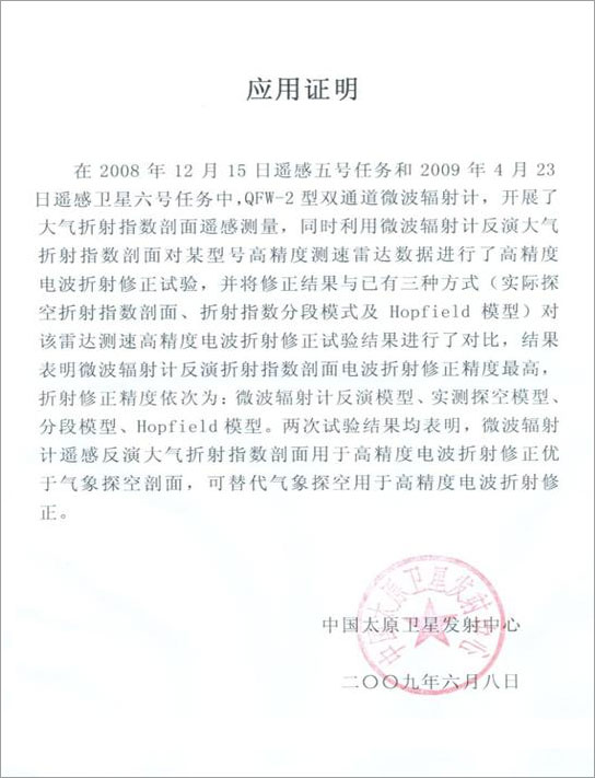 在2008年12月15日遙感五號任務和2009年4月23日遙感衛星六號任務中,我單位利用QFW-2000型微波輻射計(雙通道微波輻射計),開展了大氣折射指數剖面遙感測量,同時利用微波輻射計反演大氣折射數剖面對某型號高精度測速雷達數據進行了高精度電波折射修正實驗,并將修正結果與已有三種方式(實際探空折射指數剖面、折射指數分段模式及Hopfield模型)對該雷達測速高精度電波折射修正試驗結果進行了對比,結果表明微波輻射計反演折射指數剖面電波折射修正精度最高,折射修正精度依次為:微波輻射計反演模型、實測探空模型、分段模型、Hopfield模型。兩次試驗結果均表明,微波輻射計遙感反演大氣折射指數剖面用于高精度電波折射修正優于氣象探空剖面,可替代氣象探空用于高精度電波折射修正。